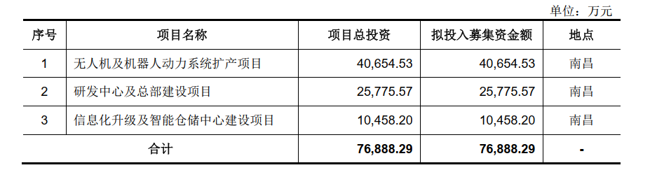 公司本次上市募集资金,将投向“无人机及机器人动力系统扩产项目”“研发中心及总部建设项目”及“信息化升级及智能仓储中心建设项目”共3个项目。