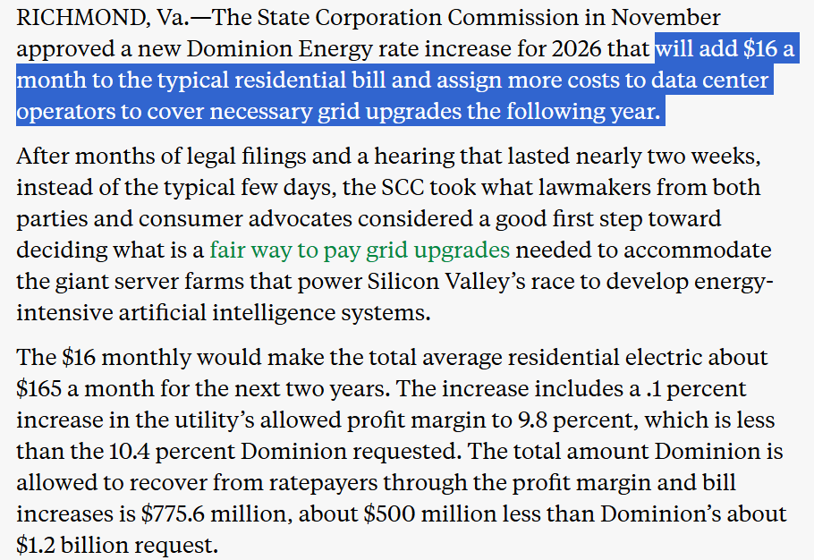 据彭博社的调查,在弗吉尼亚北部,过去五年内电力批发成本飙升了 267%,而为了覆盖未来的电网升级成本,弗吉尼亚州企业委员会(SCC)批准了 Dominion Energy (该州最大的电力公司)在2026年上调电价,导致弗吉尼亚北部居民每月电费上涨约16美元。