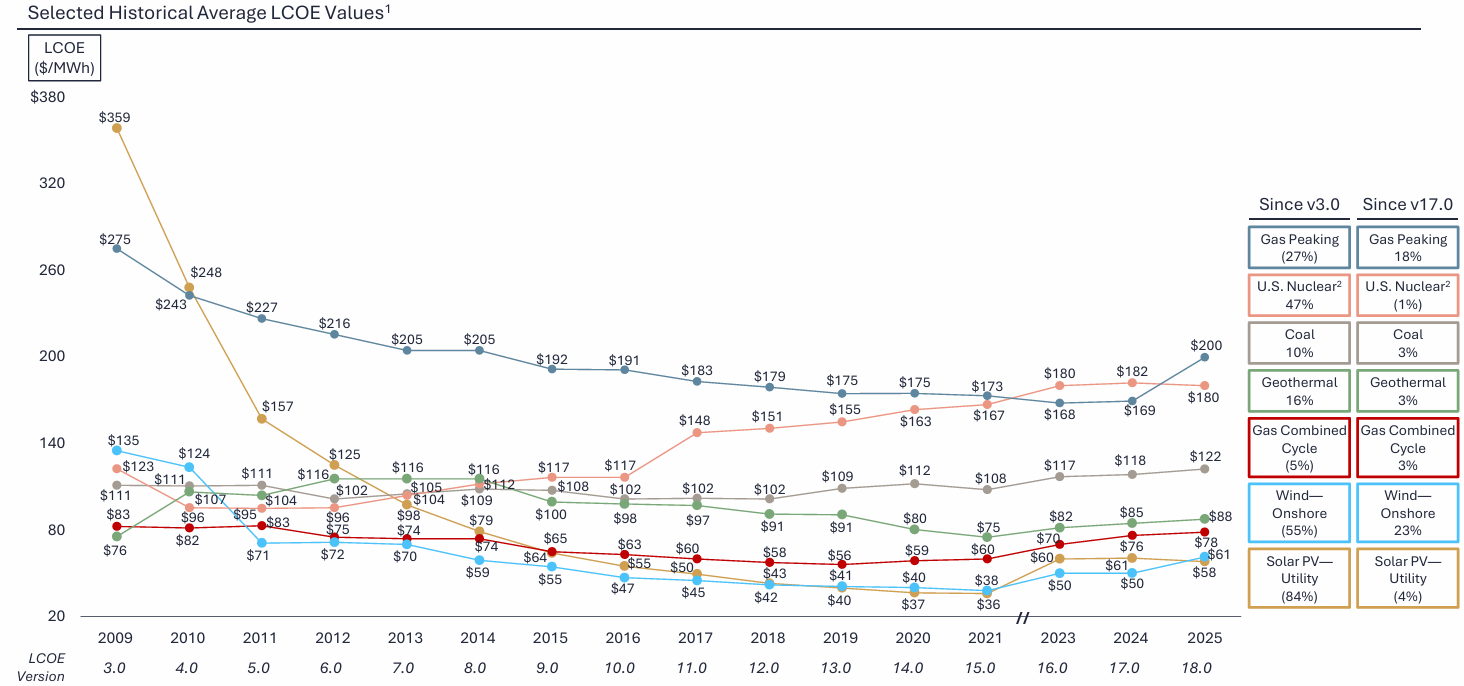 根据拉扎德在2025年6月发布的《平准化能源成本分析—第18.0版》,在不考虑补贴情况下,北美光储一体的度电成本为0.050~0.131美元/度,风储一体的度电成本为0.044~0.123美元/度,燃气发电成本为0.048~0.107美元/度,从下图可见,三者的发电成本相较于煤电、核电、天然气调峰等是具备明显优势的。