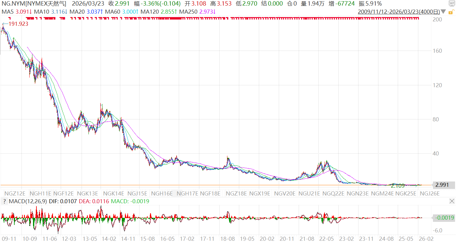 从北美天然气价格看,由于北美页岩气革命技术的影响,北美天然气价格常年稳定且非常低廉,近20年来一直处于下跌趋势,完全不受霍尔木兹海峡封闭的影响。