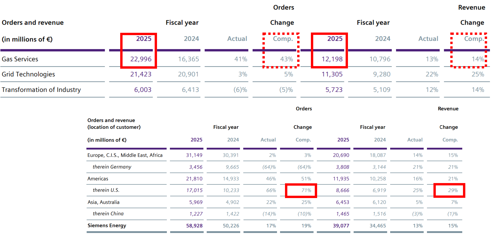 图片说明:西门子能源的燃气业务在美国市场获得爆发增长,数据来源于西门子能源2025财年年报