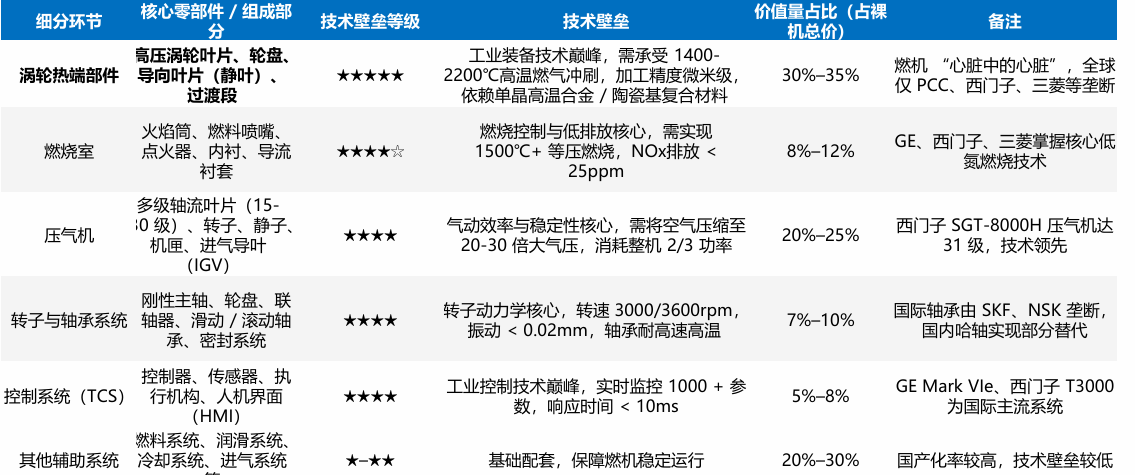 更具体地,燃气轮机由涡轮热端部件(主要是叶片)、燃烧室、压气机、转子与轴承系统、控制系统及辅助系统构成。其中涡轮热端中的叶片是核心中的核心,它需承受1400~2200℃高温燃气冲刷(压气机中的叶片相对来说要求更低一些,工况是几百摄氏度,采用锻造工艺就行),依赖单晶高温合金与陶瓷基复合材料,加工精度达微米级,全球仅少数厂商垄断,技术壁垒最高。同时其价值量占裸机总价的30%~35%。单兆瓦造价能够达到100万美元以上,因为它的工作方式和航空发动机是一样的,甚至很多就是航改过来的,所以供应链体系和航发重合度很高。