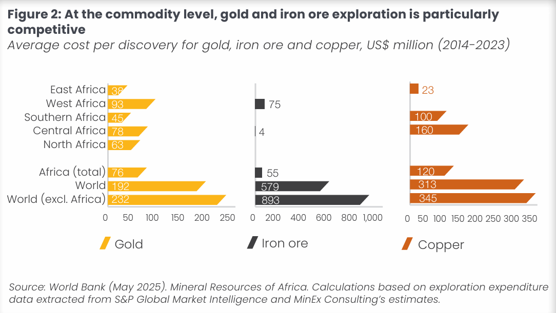 非洲的矿产勘探成本优势同样显著。在非洲进行一项重大矿产勘探的平均成本约为1.54亿美元,仅为全球平均水平(2.19亿美元)的70%。铜矿发现成本尤为突出:非洲平均为1.2亿美元,而全球高达3.45亿美元。当前全球铜市场正步入供给趋紧的周期,非洲是少数能够提供实质性新增供应的地区。