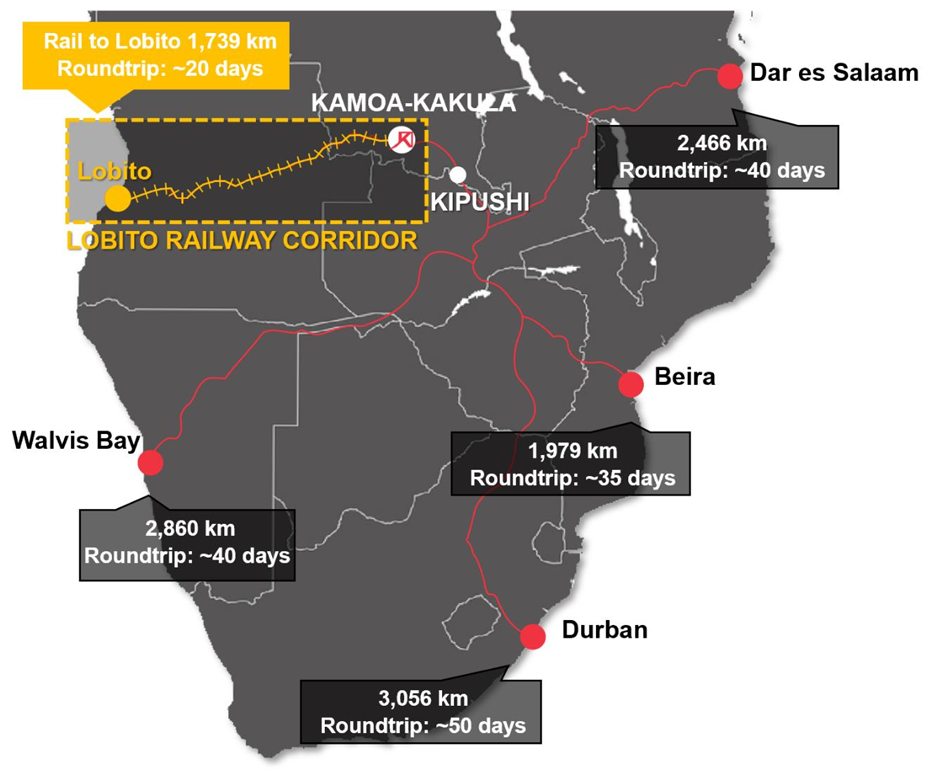 图片说明:卡莫阿-卡库拉的出口路线图,数据来源于艾芬豪矿业