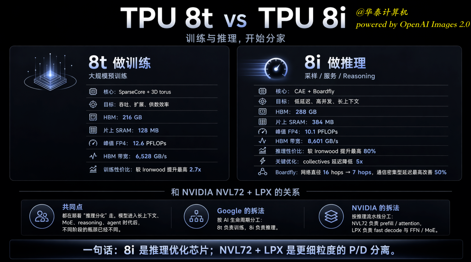 图片说明:谷歌TPU 8t与TPU 8i的核心参数差异,数据来源于华泰证券