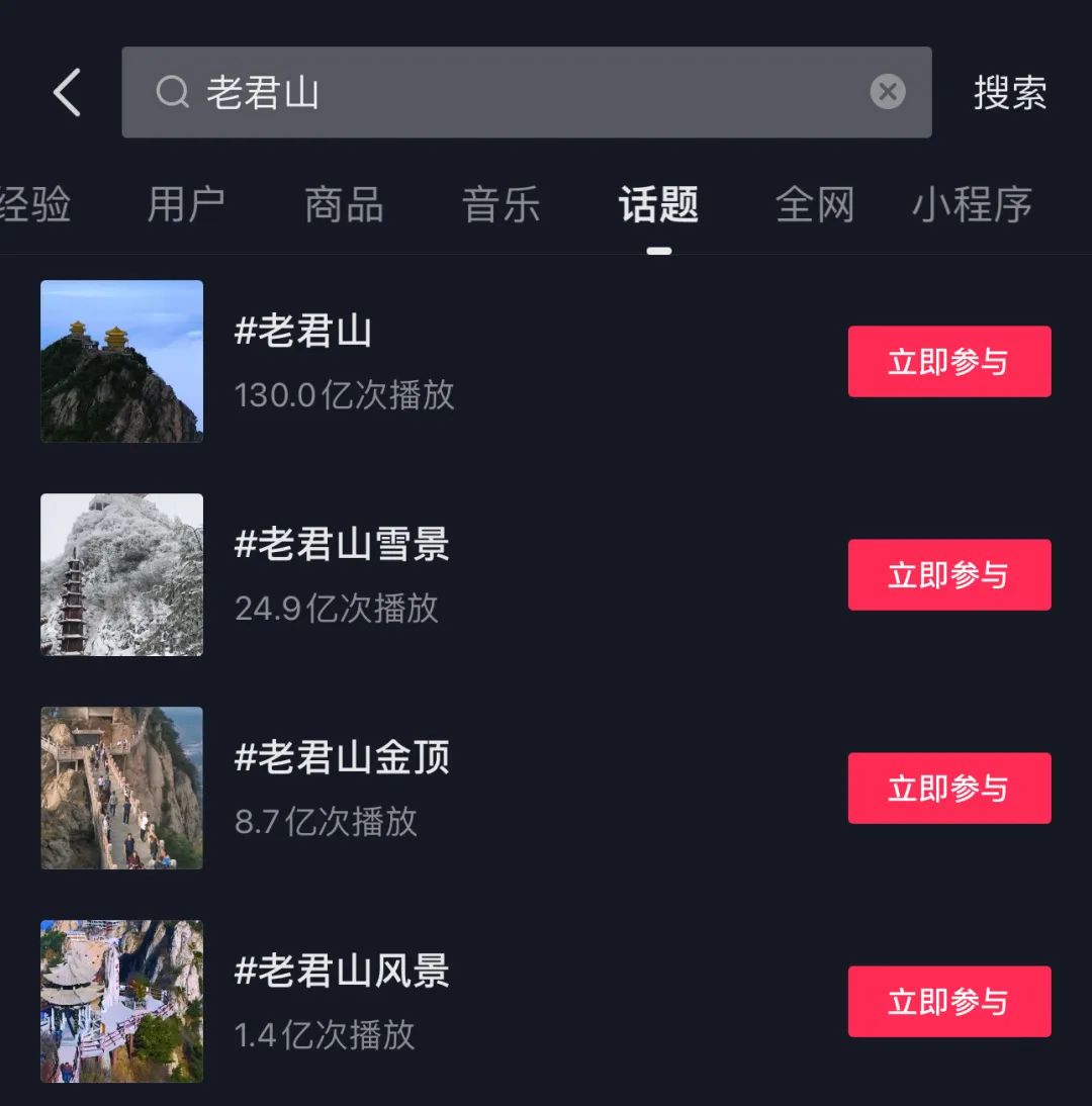 这两年,老君山在短视频平台屡屡出圈,“老君山”“老君山雪景”“老君山金顶”等话题在抖音一直保持巨大的热度,其中“老君山”话题拥有共计130亿次的播放量,可以说是妥妥的网红景区。