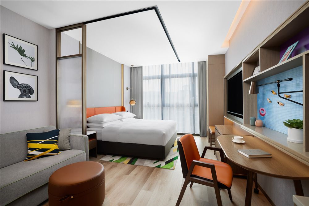 三是,更为灵动的功能设计,所有的家具都是灵动的,包括可移动的办公桌、可随心变换的沙发床、可移动的行李凳等,客人可从办公到聚会随心“组合”自己需要的场景,可开合的屏风把沙发区与好眠区分隔开,旅行累了一天,爸爸在沙发区带娃不影响妈妈小憩休息;
