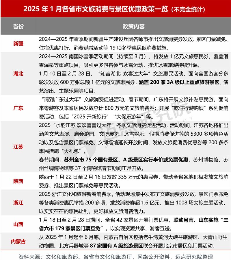 1月,以湖北、广东、江苏、浙江等为代表,各省纷纷启动春节文旅消费促进与惠民活动,如湖北发放总额1亿元的文旅惠民券、浙江推出文旅消费券及门票减免等200余项惠民举措等,以实实在在的惠民让利,激发和释放文旅消费活力。