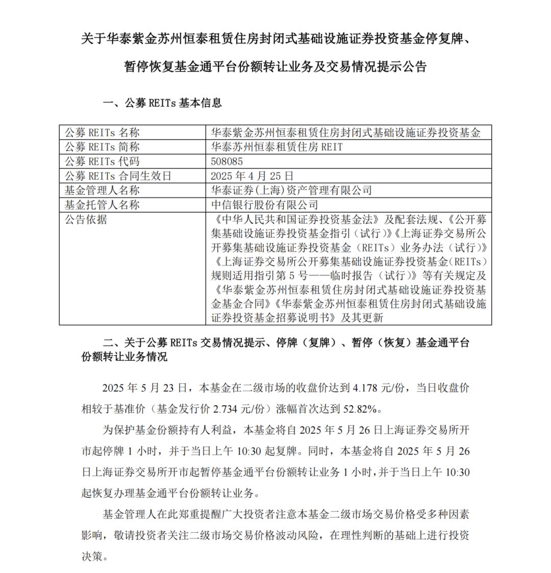 5月21日,华泰苏州恒泰租赁住房REIT在上交所上市,首日开盘即上涨29.99%,触及公募REITs上市首日30%的涨幅上限,次日继续触发非上市首日10%的涨幅限制。5月23日收盘价达4.178元/份,相较于基准价2.734元/份,累计涨幅达52.82%,再次触发停牌机制。