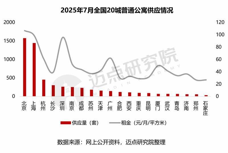 2025年7月,全国20城普通公寓供应量增幅显著,租金环比下滑。