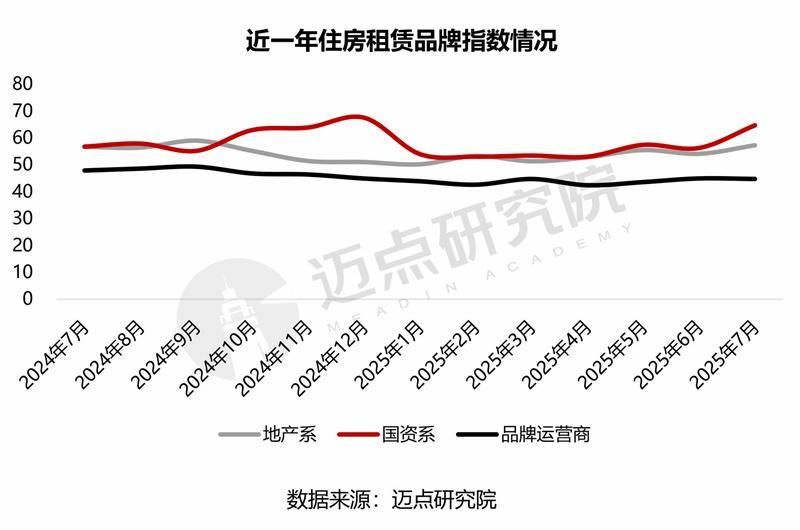 7月,各大品牌加大在媒体的宣传力度,积极开展营销活动,吸引毕业季租客,同时加快项目入市速度,行业品牌指数上升明显,环比上升7.4%至54.9。其中,国资系品牌指数大幅上涨15%至64.7;地产系品牌指数上涨5.8%至57.3;品牌运营商指数微降0.4%至44.8。