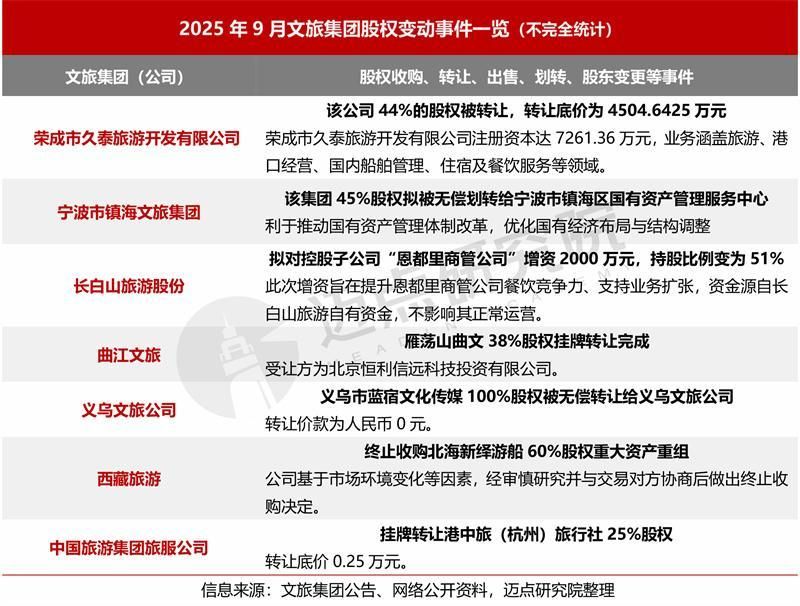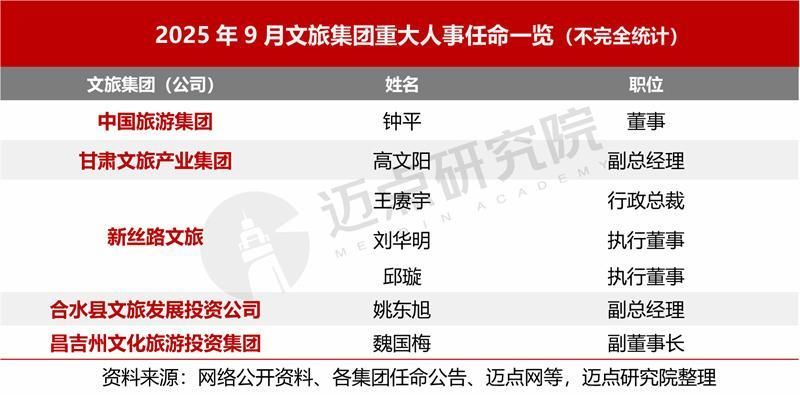9月文旅集团动态总结:人事层面,钟平接任中国旅游集团董事、王赓宇出任新丝路文旅行政总裁;文旅集团股权交易动态频繁,如长白山旅游股份增资“恩都里商管公司”、西藏旅游审时度势终止收购北海新绎游船60%股权等。