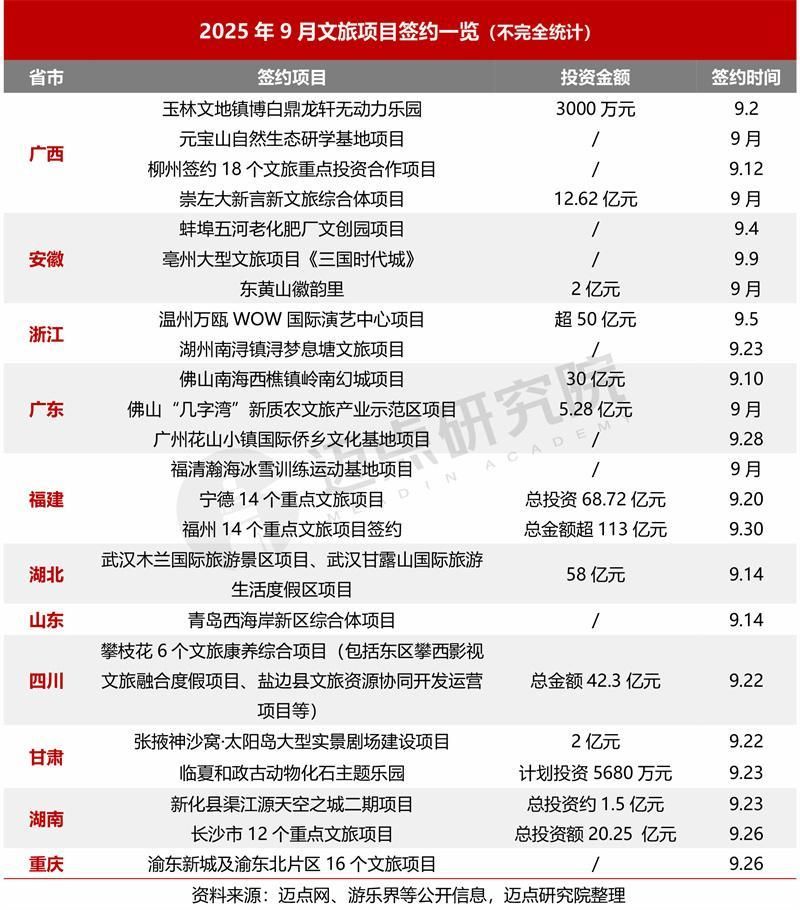 9月文旅项目动态观察:广西、福建、湖南等省份文旅项目集中签约,加大文旅产业投资力度;德阳三星堆文化旅游区(投资70亿元)、广州正佳帽丰湾国际文化旅游度假区(总投资约40亿元)、北京海昌海洋公园等重量级项目开工,将有效提升地方与区域文旅产业发展能级。