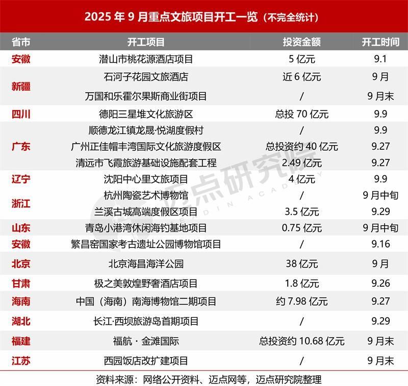 据迈点研究院不完全统计,2025年9月全国开工重点文旅项目共18个,以酒店、度假区、旅游区等综合型、复合型项目为主。如以德阳三星堆文化旅游区为例,项目全部建成后,将成为集文化体验、休闲度假、商贸会展于一体的世界级东方经典文化旅游目的地,进一步提升三星堆文化国际影响力。