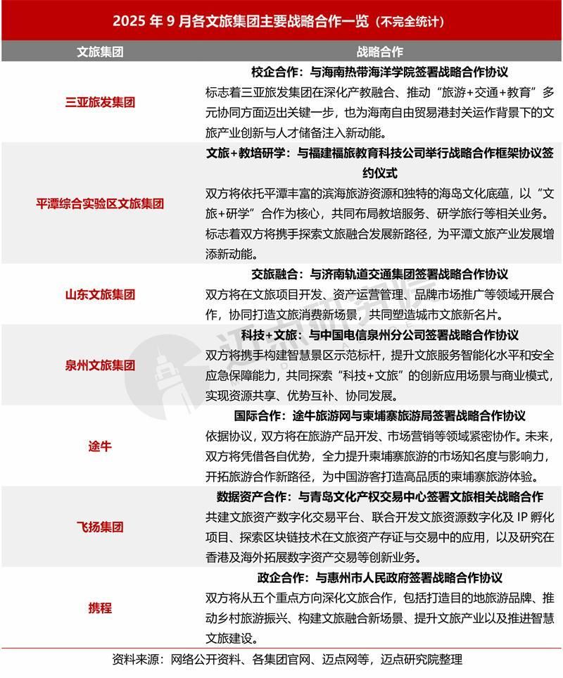 据不完全统计,2025年9月,共有7起文旅集团战略合作事件,涉及校企合作、文旅+研学、交旅融合、文旅+科技、国际合作、数据资产、政企合作、国际合作等多领域、多维度,表明文旅集团的业务拓展深化、跨界与联动能力提升,利于扩大各文旅集团的品牌知名度与影响力。