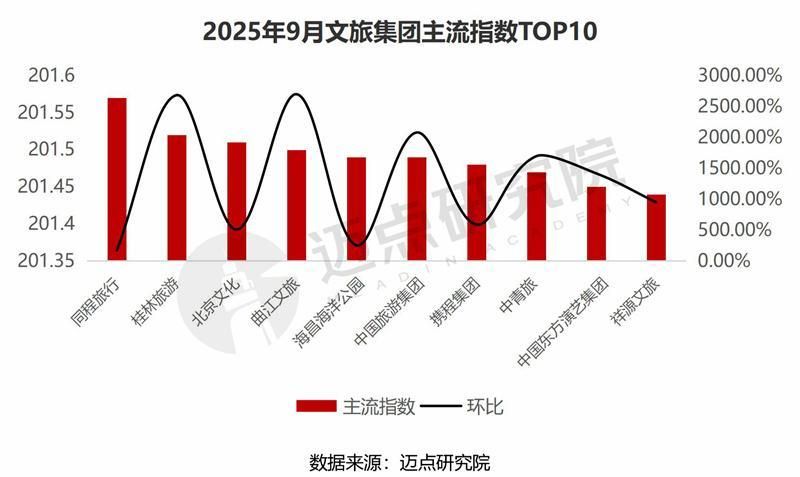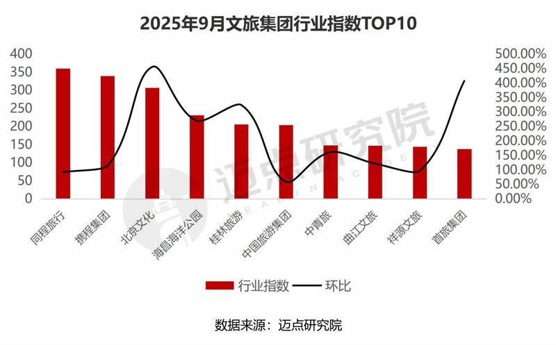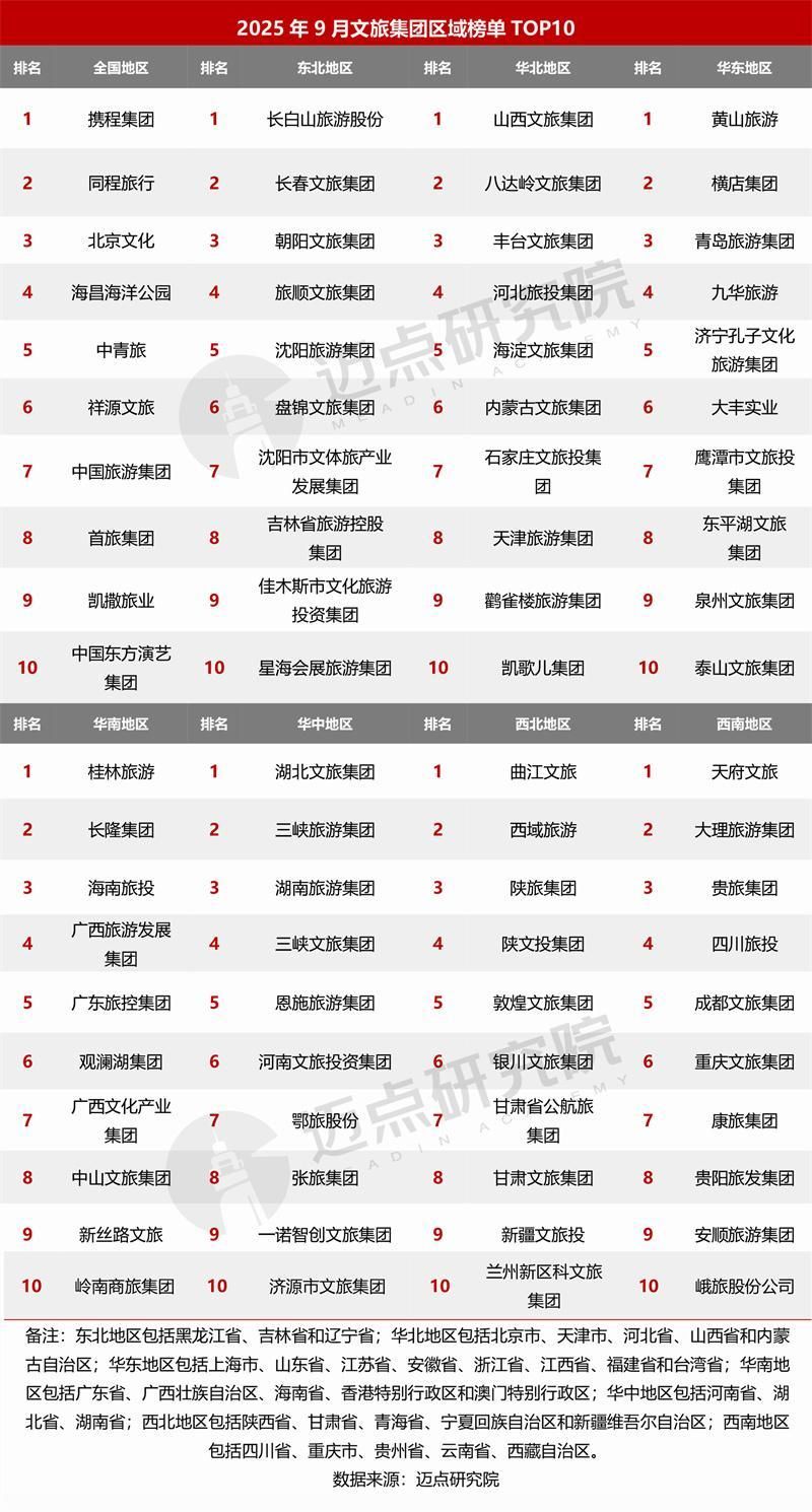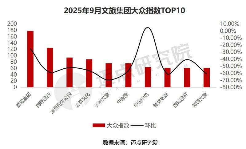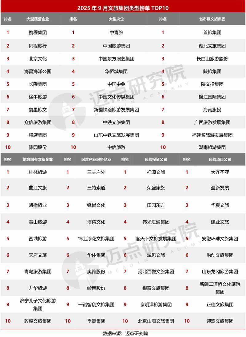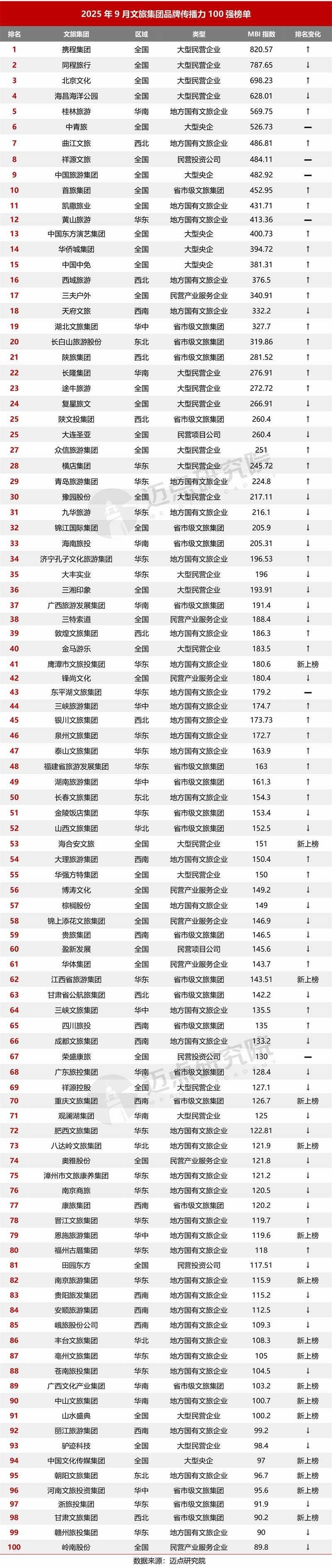 据迈点研究院数据显示:9月,携程集团、同程旅行、北京文化、海昌海洋公园、桂林旅游、中青旅、曲江文旅、祥源文旅、中国旅游集团、首旅集团位列榜单前十。其中,百强榜单中共有37家文旅集团排名环比上升,41家文旅集团排名环比下降,16家文旅集团为新上榜,6家文旅集团排名保持不变。