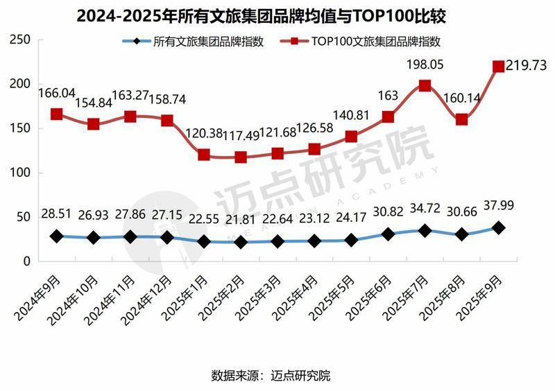 经迈点研究院监测数据显示,2025年9月,所有文旅集团的品牌指数值为37.99,同比上升33.25%,环比增长23.91%;TOP100文旅集团品牌指数值为219.73,同比增长32.34%,环比上升37.21%。可见,为迎接国庆中秋黄金周,各集团加大品牌营销推广、创新活动与产品供给等,9月文旅集团品牌指数整体呈增长态势。