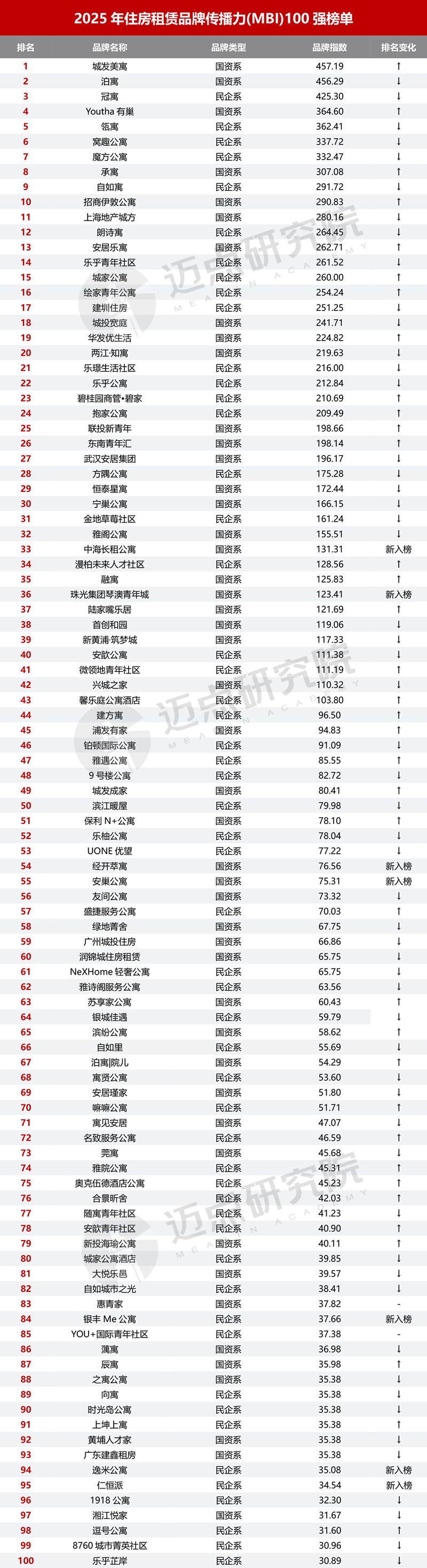 以下是迈点研究院独家发布的“2025年住房租赁品牌传播力(MBI)100强榜单”,其中城发美寓、泊寓、冠寓、Youtha有巢、瓴寓、窝趣公寓、魔方公寓、承寓、自如寓和招商伊敦公寓进入榜单前十。本年度100强榜单中,36个品牌的品牌排名同比上升;55个品牌的品牌排名同比下降;2个品牌的品牌排名同比没有变化;7个新入榜品牌。