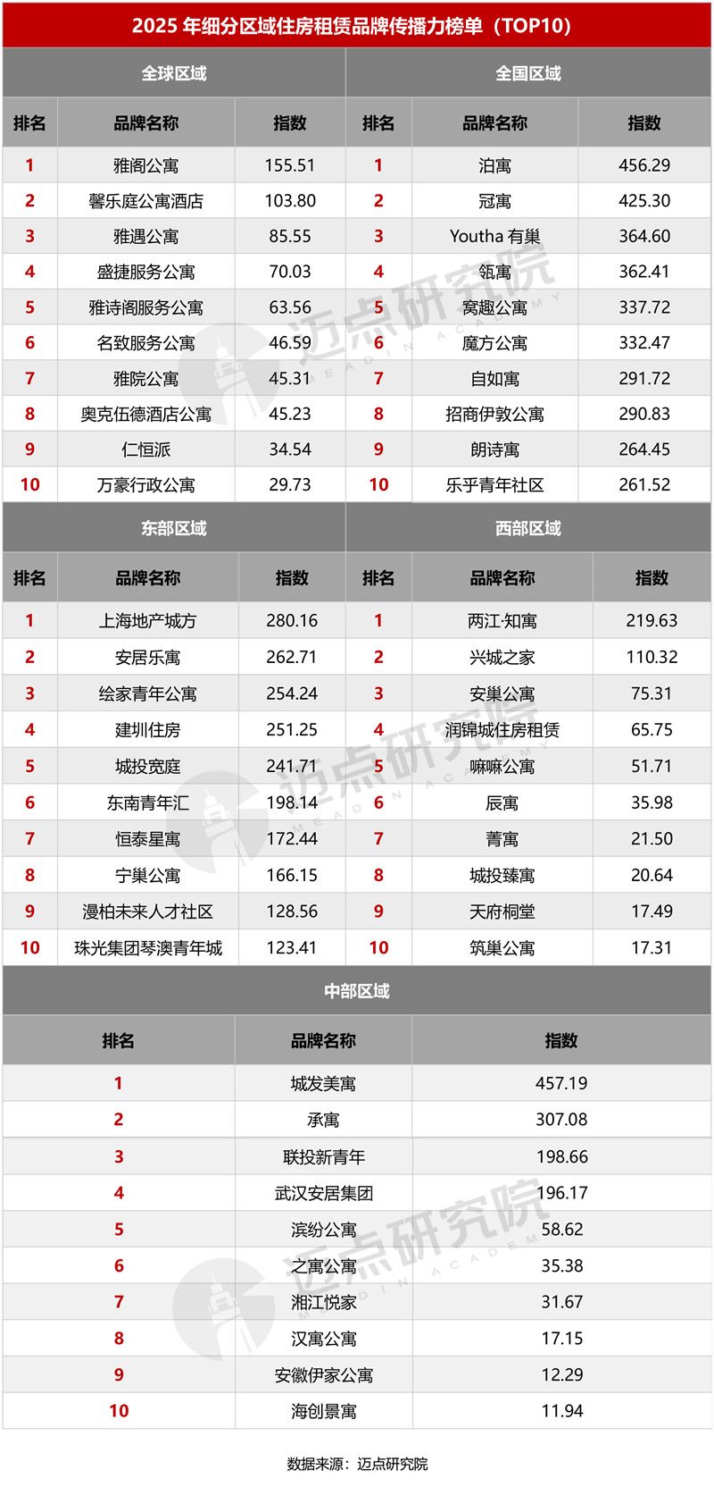 “2025年住房租赁品牌传播力榜单”数据来源于迈点品牌指数MBI,根据迈点品牌指数MBI 291家品牌数据汇总统计而成。具体说明如下: