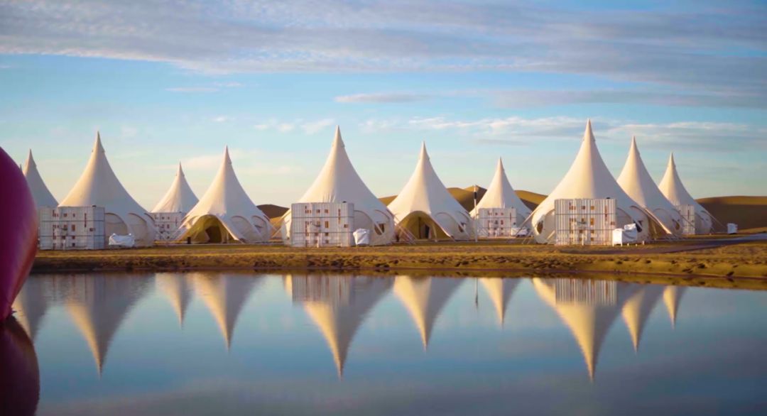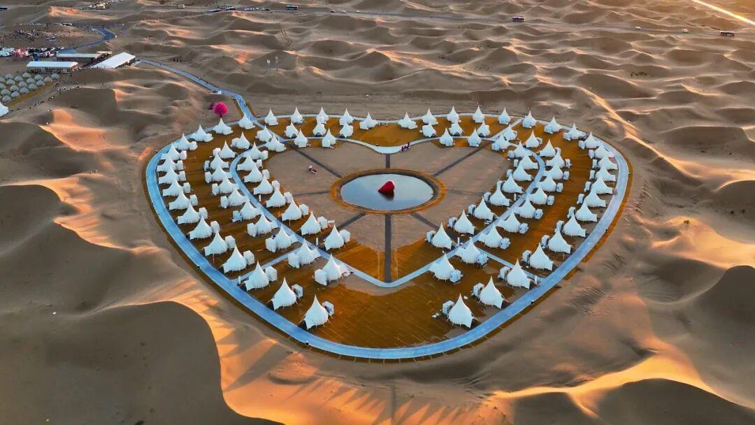酒店紧邻沙坡头音乐盛典基地,75.9亩的占地面积,3300万元精心打造,建成了88间高端帐篷客房。酒店的建筑设计延续沙坡头星空理念,整体造型为“心”型,寓意“人的一切思维情感皆由心生”,更藏着景区“用心服务”的初心。