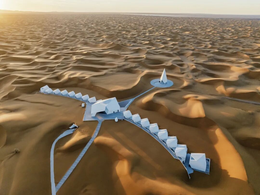 S帐篷酒店采用米白色摩尔莲花帐篷,与沙漠黄色相融浑然一体,33㎡的空间分设大床房、亲子房和标间,独立卫生间与空调的配备,彻底打破人们对“帐篷住宿”的简陋印象,兼顾自然体验与居住舒适。