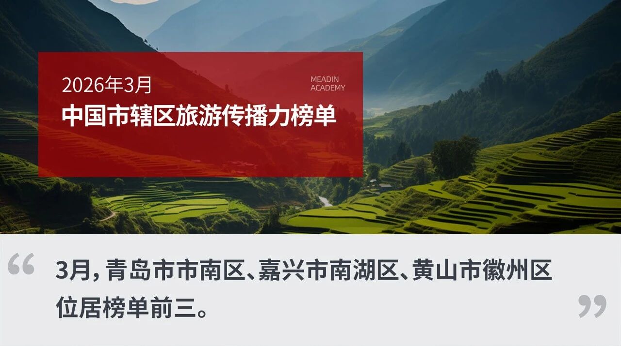 经迈点研究院监测,3月所有市辖区的旅游传播力指数均值为80.33,环比下降0.45%;综合实力100强市辖区旅游传播力指数均值为96.11,环比下降0.22%。指数均呈现小幅回落,主要受春节后各地大型节庆活动减少、媒体宣传与线上推广投入阶段性收缩影响,春季旅游尚处启动期,市场进入蓄势调整期,整体传播热度较春节旺季平稳回落。