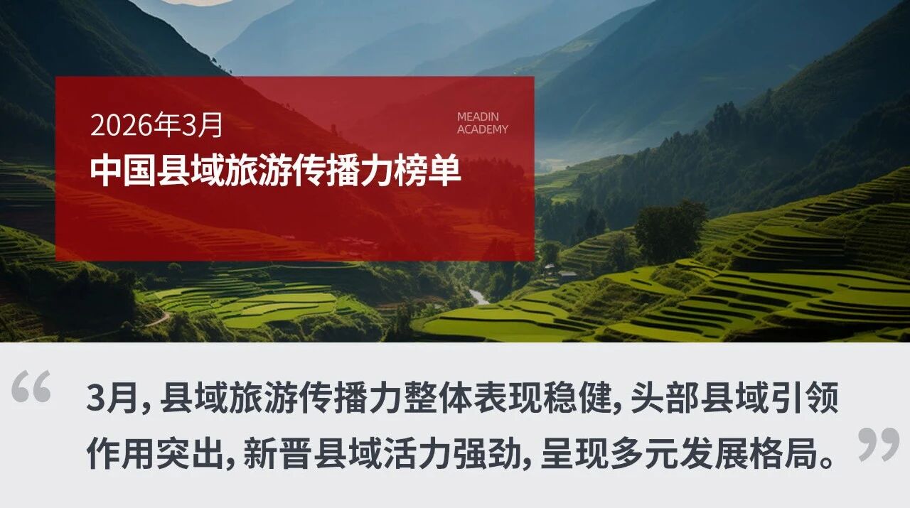 以下是迈点研究院独家发布“2026年3月中国县域旅游传播力综合实力100强榜单”和“2026年3月中国县域旅游传播力成长潜力100强榜单”。