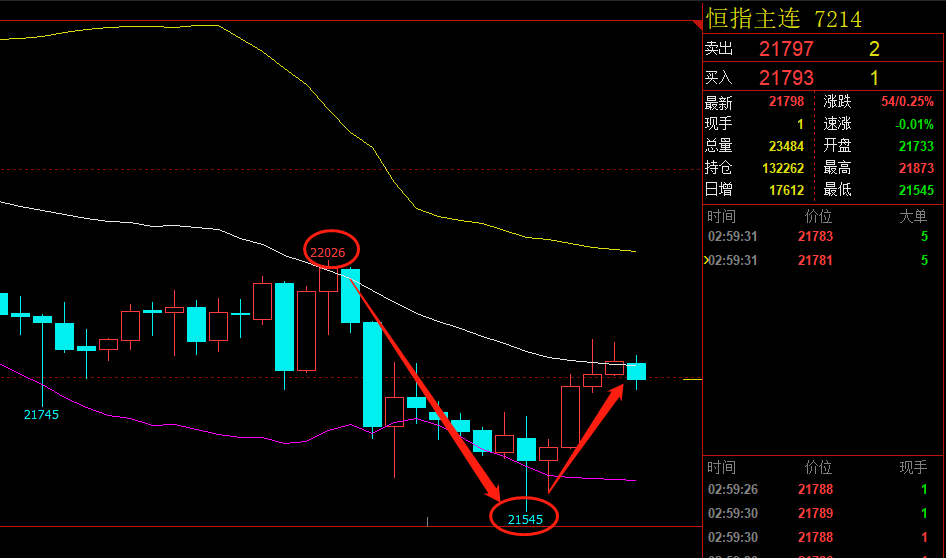 恒指07合约今日休市停盘,昨日6.30给出21980空单,最高反弹22026位置开始下跌,突破21660止盈目标点位。止盈之后策略在21530附近给出多单,最低跌至21545在进场点位附近,若有进场等待持续反弹,后市开盘依旧回落做多为主。