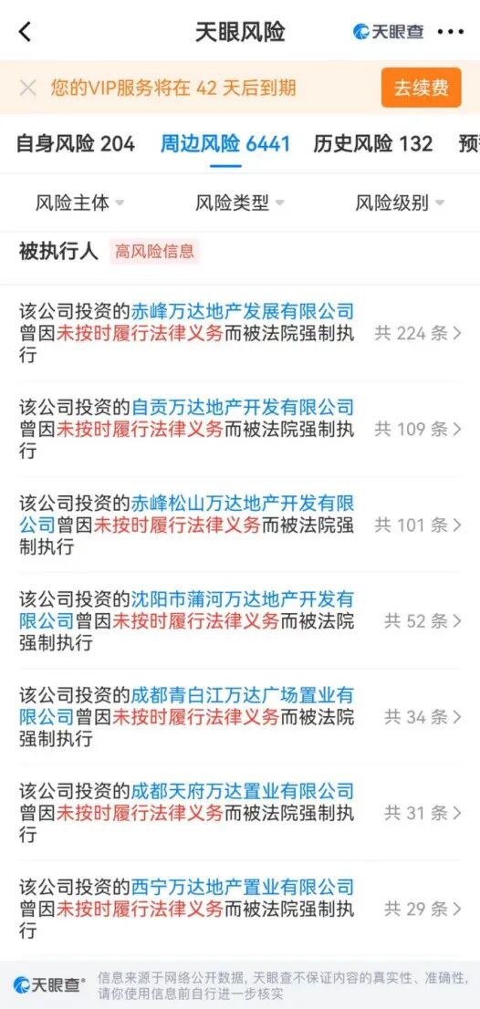 天眼查的数据显示,如西宁万达地产置业被累计强制执行2131万元;成都天府万达置业有限公司被累计强制执行1253万元;赤峰万达地产发展有限公司被累计强制执行1092万元;沈阳市蒲河万达地产开发有限公司被累计强制执行1130万元;沈阳河滨万达地产发展有限公司被累计强制执行1050万元;
