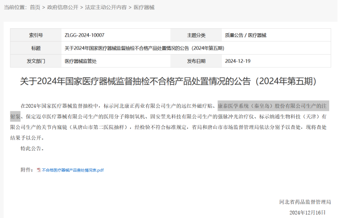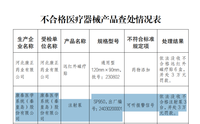 去年年底,河北省药品监督管理局发布了2024年国家医疗器械监督抽检不合格产品处置情况的公告,其中创业板上市公司康泰医学系统(秦皇岛)股份有限公司(以下称康泰医学)生产的注射泵赫然在列。