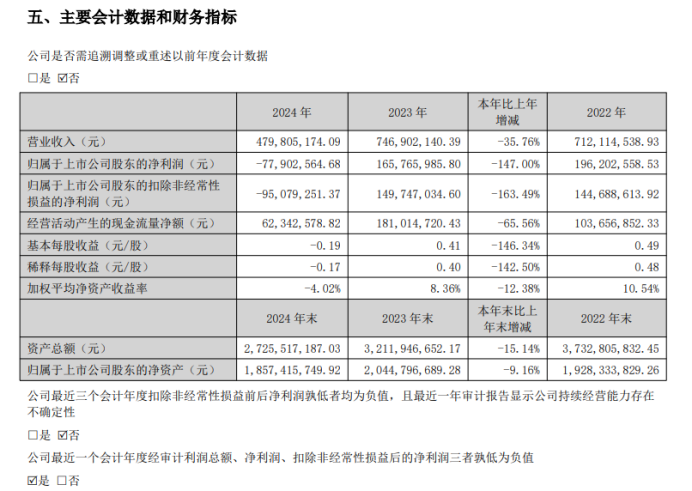 年报数据显示,2024年康泰医学营业收入4.798亿元,较上年同期减少了35.76%,归母净利润为净亏损7790万元,同比大跌147%,扣非净利润更是大幅亏损9508万元。