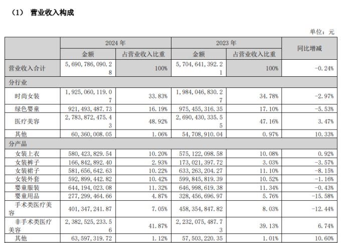 年报数据显示,2024年朗姿股份营业收入56.91亿元,同比略降0.24%,归母净利润2.572亿元,同比略增1.38%。