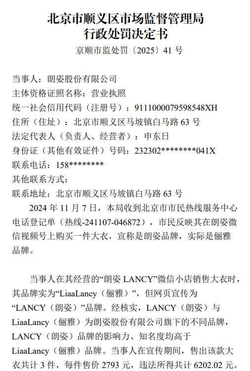 处罚决定书显示,有消费者通过朗姿视频号购买了一件大衣,宣称是朗姿品牌,结果收到货是朗姿旗下的子品牌俪雅,市场监管部门认定,朗姿品牌知名度和影响力均要高于俪雅品牌,朗姿股份的上述行为侵犯了消费者的合法权益,因此被处以罚款处罚。
