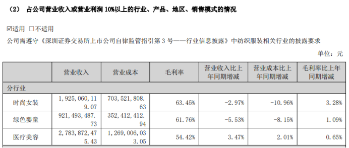 上述三个业务板块的毛利率分别是63.45%、61.76%、54.42%,可以说不管是女装、婴童还是医美,三大业务板块的毛利率还是非常可以的。