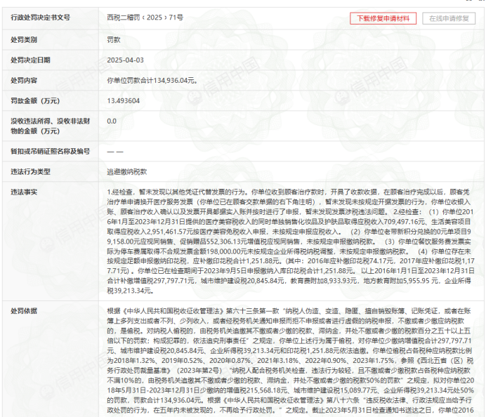 今年4月份,朗姿股份全资子公司陕西高一生医疗美容医院有限公司因存在逃避缴纳税款行为,被当地税务部门罚款13.49万元。