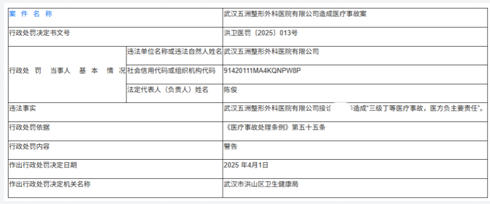 4月初,全资子公司武汉五洲整形外科医院有限公司被武汉市洪山区卫生健康局查处,该医院因接诊罗某某造成“三级丁等医疗事故,医方负主要责任”。