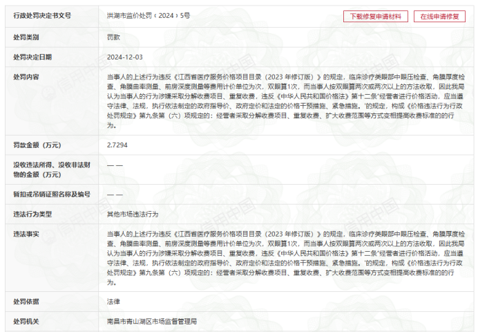 南昌普瑞眼科在去年12月,也因为将双眼检查一次算两次费用的行为,被认定为“分解收费项目、重复收费”,被市场监管部门处罚。