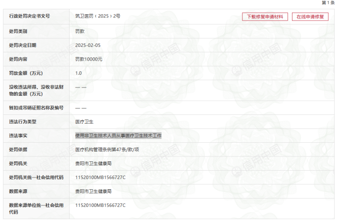 今年2月份,贵州普瑞眼科医院有限公司因存在“使用非卫生技术人员从事医疗卫生技术工作”的违法行为,被贵阳市卫生监管部门查处。