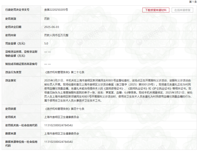 5月份,该公司又因为在许可的眼科执业地点之外开展义诊活动,被上海虹口区卫健委处罚(处罚文书号:虹第2220250213号),今年1-3月份,该公司因为未经备案批准擅自开展义诊活动或在执业地点外开展义诊活动被上海多个区的监管部门处罚。