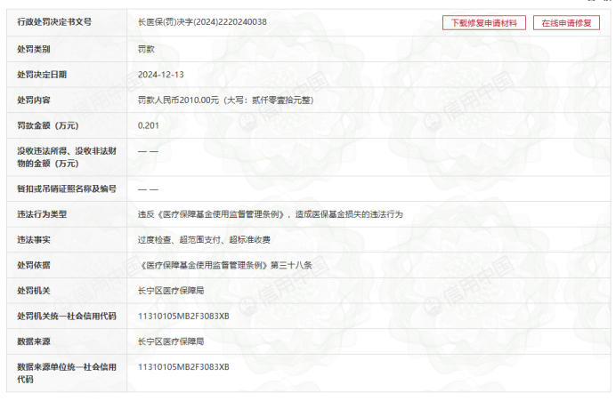 去年12月份,该公司因为存在“过度检查、超范围支付、超标准收费”等违规行为,造成造成医保基金损失,从而被长宁区医保局查处。