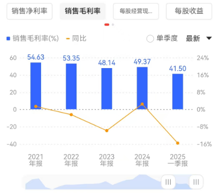 与业绩下滑对应的,是联环药业的盈利能力。据财报数据显示,2021年至2024年,联环药业的销售毛利率分别为54.64%、53.35%、48.14%、49.37%,整体呈下滑趋势,至今年一季度,毛利率继续暴跌至41.%。