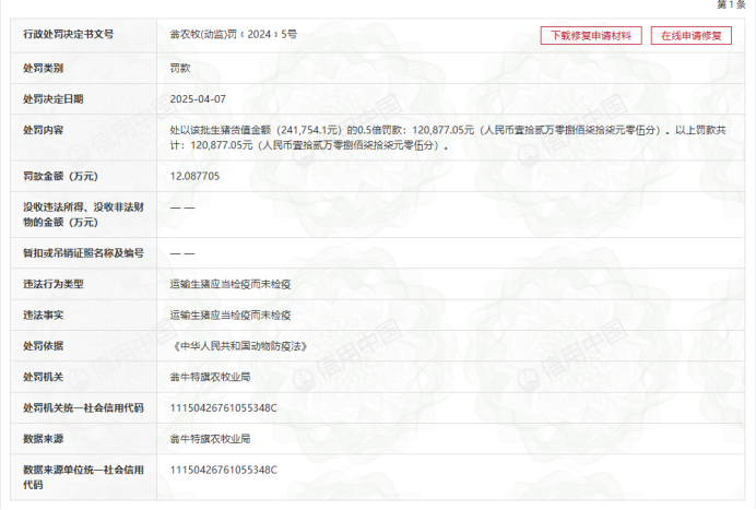 信用中国数据显示,今年4月份,该公司旗下子公司中粮家佳康(赤峰)有限公司因运输未经检疫的生猪,被翁牛特旗农牧业局罚款12.09万元,这批未经检疫的生猪货值高达24万多元。