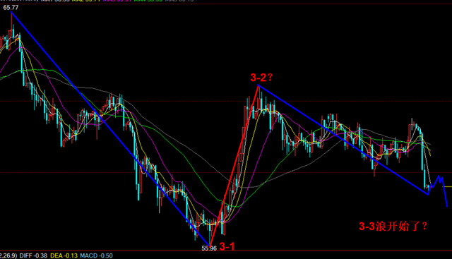 昨日这波行情的下跌可能就是3-3浪或者5浪的开始了,因为我们前期一直在等待行情是否还要继续上涨走abc三个子浪组成的3-2浪或者4浪,从目前的走势来看,我们暂且把这波上涨数浪为3-2浪,这样的话前面的高点62.59美元是3-2浪的终点了,也是3-3浪的起点了,那么昨日的下跌就是3-3浪的正式启动轨迹了,那么我们就看这波3-3浪在继续下跌中跌破前期低点55.96美元之后会不会再反弹上涨一波3-4浪,如果是这样走的话,就能确定目前的这波下跌是3-3浪了,目前为什么先假设这波下跌是3-3浪呢?因为不管是3-3浪还是主跌5浪至少在方向上是一致的,所以我们先这样去数浪和完成短期的结构,所以今日的操作依旧是等待行情稍微有反弹上涨就做空,因为昨日跌得过猛,今日应该会有一些反弹修整之后再跌的。