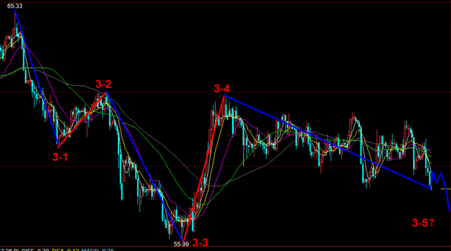 昨日的行情基本上就是按照老李昨日的梳理预判去走的,也就是亚欧盘慢上涨到昨日的空单点位然后再下跌,昨日的行情涨到最高点60.10美元,而老李建议做空的点位是60.05美元,所以说昨日的空单是比较完美的,行情从60.10美元的下跌一直延续到目前还在慢跌,而昨日的下跌基本上确定了3-2浪的结束和3-3浪的开始了,现在就看这波3-3浪能不能跌破55美元了,其实老李在昨日的梳理中还发现了一个问题,就是新的2601号主力合约在我们前期的数浪中3-4浪的终点没有超过3-2浪的终点,所以也可以把目前的下跌看着是3-5浪,(我会在下方的画图中呈现出来)因为不管是3-3浪还是3-5浪在方向上是一致的,所以我们今日还是继续空为主。