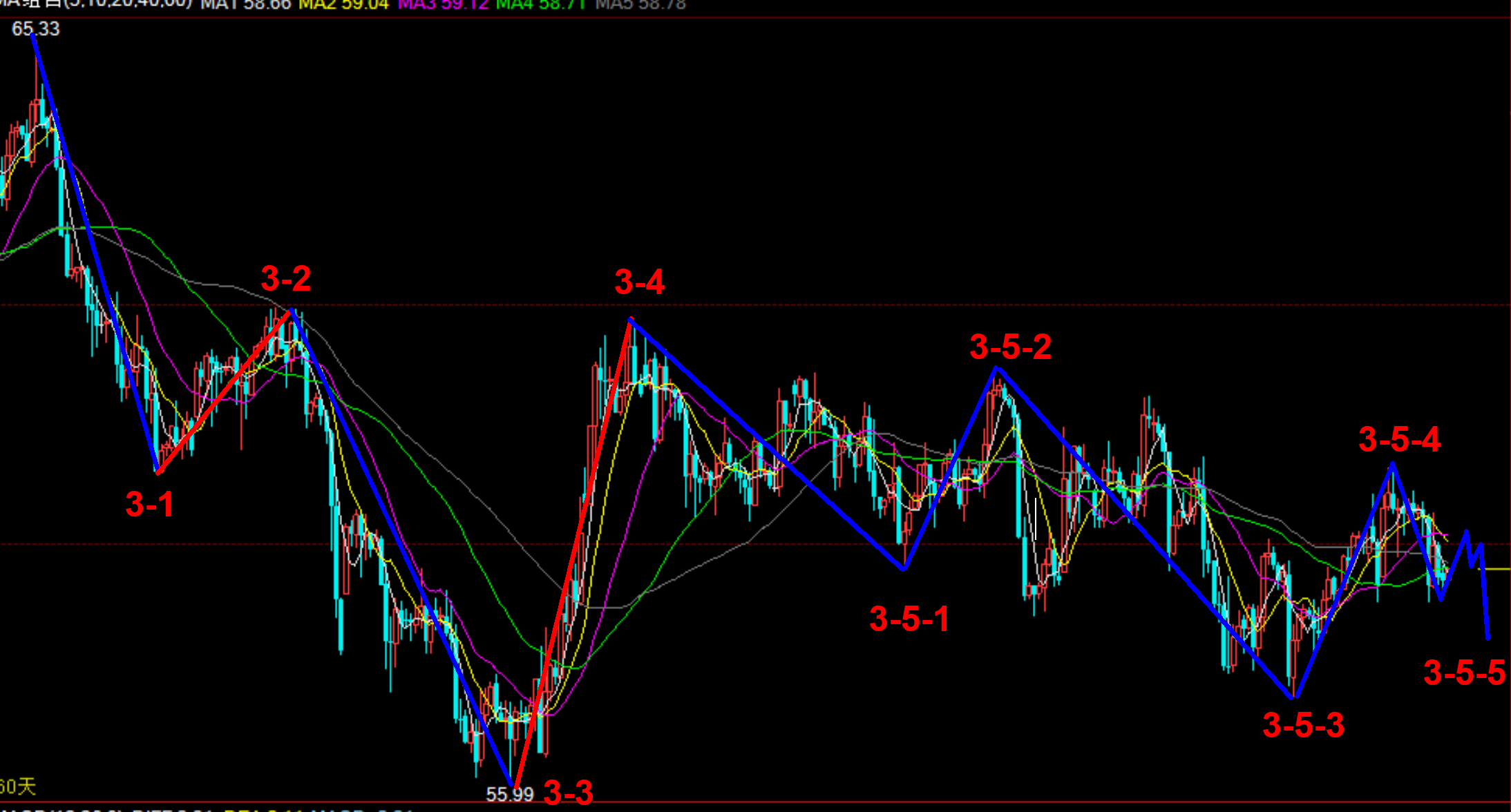 综上数浪:市场正处于A-B-C调整浪的C浪下跌阶段。B浪反弹在59.6美元下方已然乏力,确认了上方压力的有效性,当前走势的核心是关注C浪下跌的力度和下方支撑的强度。(整体走势依然在我们前面所说的主跌3-5浪之中)