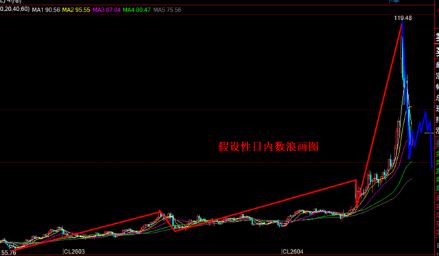 目前原油的走势受地缘局势和市场情绪影响较大,所以目前的行情也暂不适合用数浪来套在行情上,如果非要数浪在日线和4小时上从25年的最低点也就是五十多美元开始数浪的,目前的上涨已可以是走完主升5浪了,而未浪主升浪第5浪就是近期的上涨,也就是说昨日的高点119.48美元可能是主升浪5浪的终点,但是如果伊朗局势继续升级行情就还有可能继续破新高上涨,但是如果有所缓解那么下跌就会开启了,所以我们今日的操作不以数浪去为主,而是继续在压力位做空和支撑位做多,以下策略仅供参考。