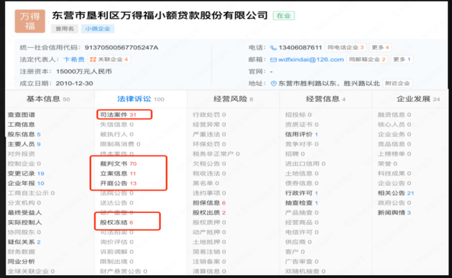 值得关注的是,东营市垦利区万得福小额贷款股份有限公司并不平凡,根据企查查资料显示,该公司仅仅涉及法律诉讼数量就超过100次,其中,涉及司法案件高达31次,涉及裁判文书高达70次、涉及立案信息达到11次,涉及开庭公告13次。
