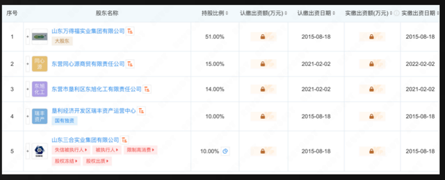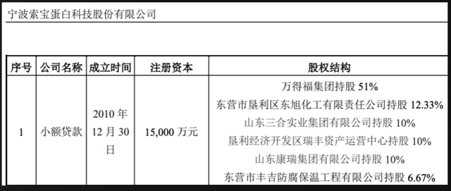 然而,索宝蛋白在招股书中却披露的信息截然不同,东营市垦利区万得福小额贷款股份有限公司的持股比列分别为万得福集团(持股51%)、东营市垦利区东旭化工有限公司(持股12.33%)、山东三合实业集团有限公司(持股10%)、垦利经济开发区瑞丰资产运营中心持股10%、山东康瑞集团有限公司(持股10%)、东营市丰吉防腐保温工程有限公司(持股6.67%)