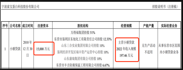 根据索宝蛋白招股说明书中披露,东营市垦利区万得福小额贷款股份有限公司主营小额贷款,2022 年收入规模却仅仅只有197.46万元。如此异常的背后,索宝蛋白在隐藏什么?