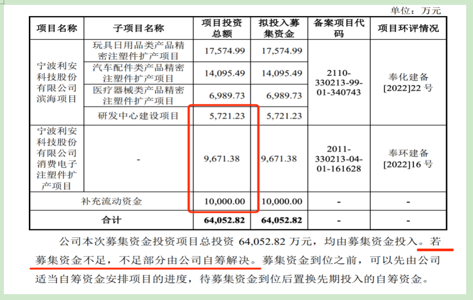 除此之外,利安科技募投项目中还包含了研发中心建设(拟投入募集资金5721.23万元),然而十分巧合的是,研发中心项目加上宁波利安科技股份有限公司消费电子注塑件扩产项目在加上补充流动性资金项目,这些次要项目累计金额为2.54亿元,刚好与实际募集资金所减少的2.42亿元前后相符。